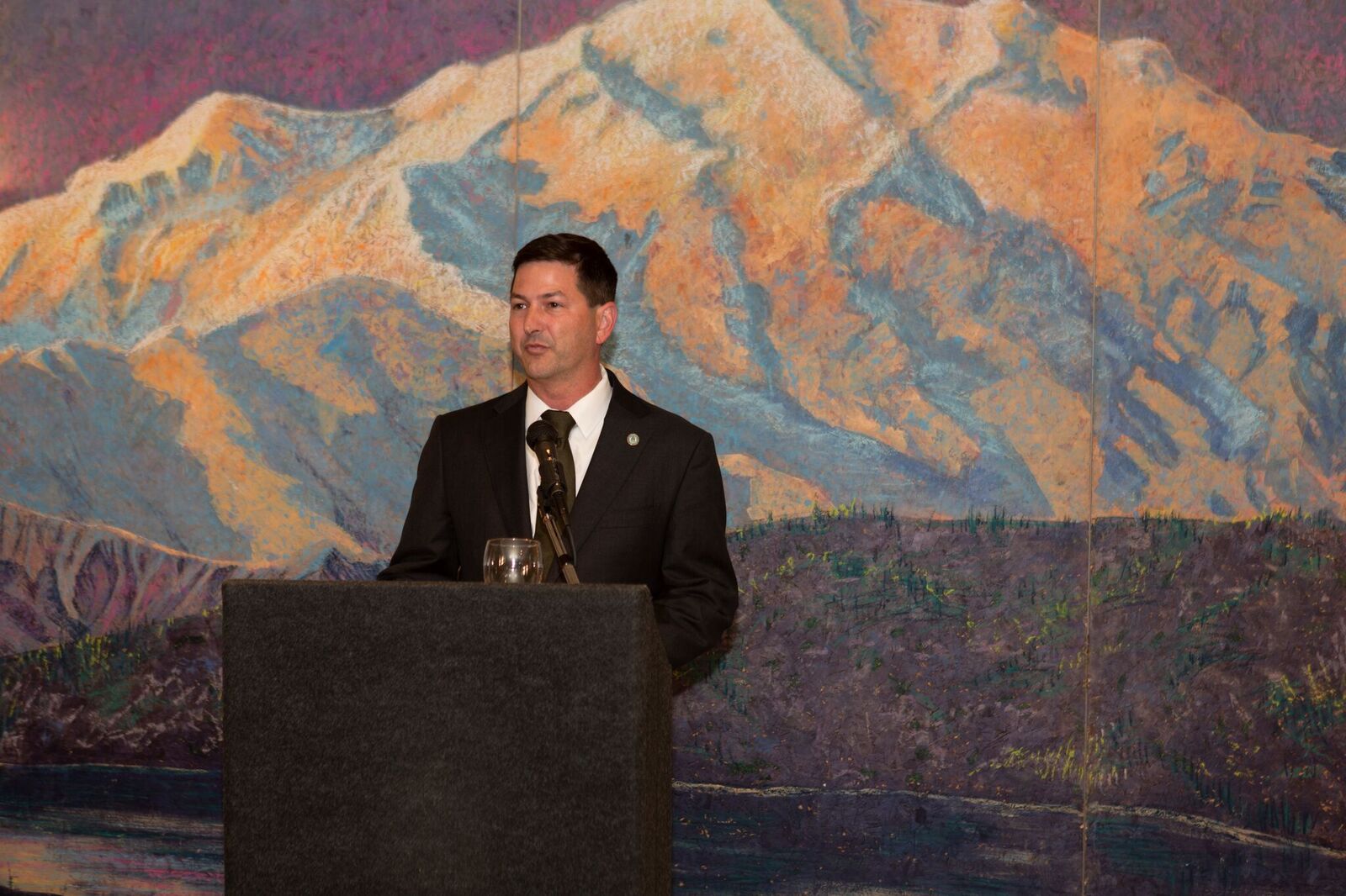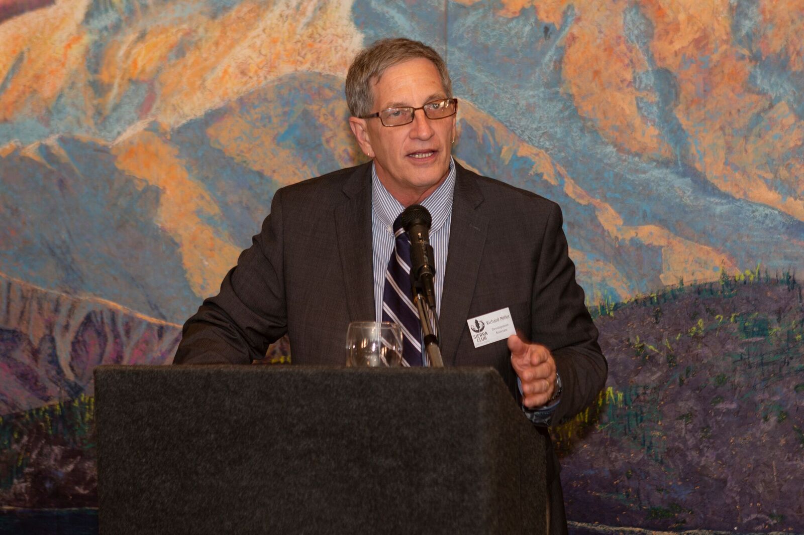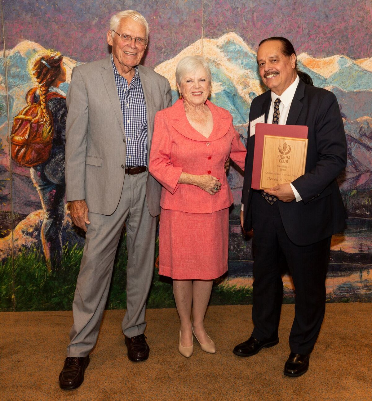 On Saturday, June 9th over 100 Sierra Club members and supporters joined in celebrating the Chapter’s 70th Anniversary Awards and Gala Celebration. The event was held at the Hilton Harbor Island. The room was filled with memorabilia from seven decades of Chapter operation including framed posters of the 53 charter members who petitioned the Sierra Club Board of Directors to create the San Diego Chapter in 1948 as the Sierra Club’s fifth Chapter. The room was dominated by the extraordinarily beautiful 8 ft by 30 ft scenic mountain mural painted by Karen Keyes, the wife of long time COL and Bus Trip Leader Mike Fry. The mural first was used in the 1980’s when the Chapter had a booth at the Del Mar Fair and had been in Mike and Karen’s garage ever since. The mural provided a spectacular setting for the Club’s 70th Celebration