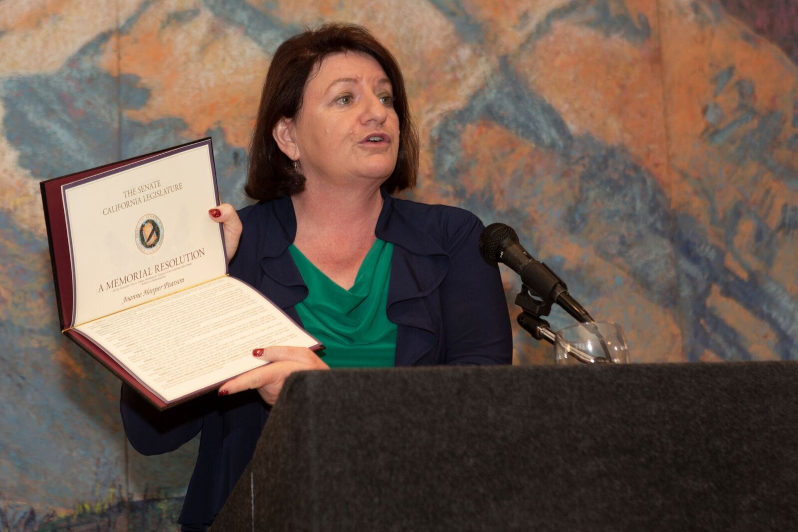 - California Senator Toni Atkins presenting CA Senate Memorial Resolution to the family of Joanne H Pearson.