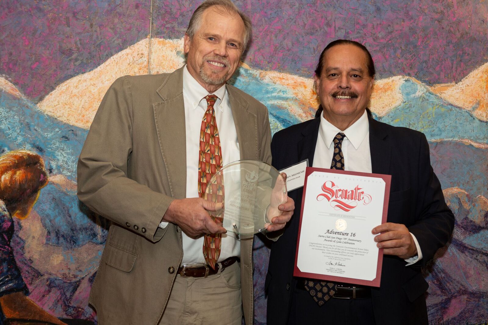 - John Mead accepting FEAT Award for Adventure 16 and CA Senate Certificate of Recognition from Chapter Chair Ruben Arizmendi