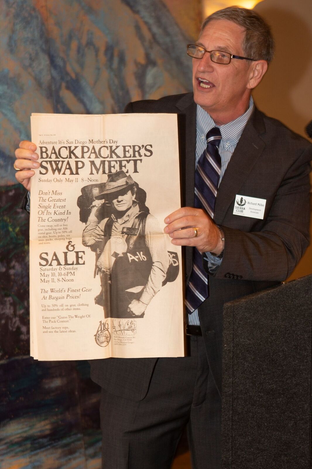 - Richard Miller holds copy of an Adventure 16 advertisement from 1986 edition of the Chapter HiSierran newsletter