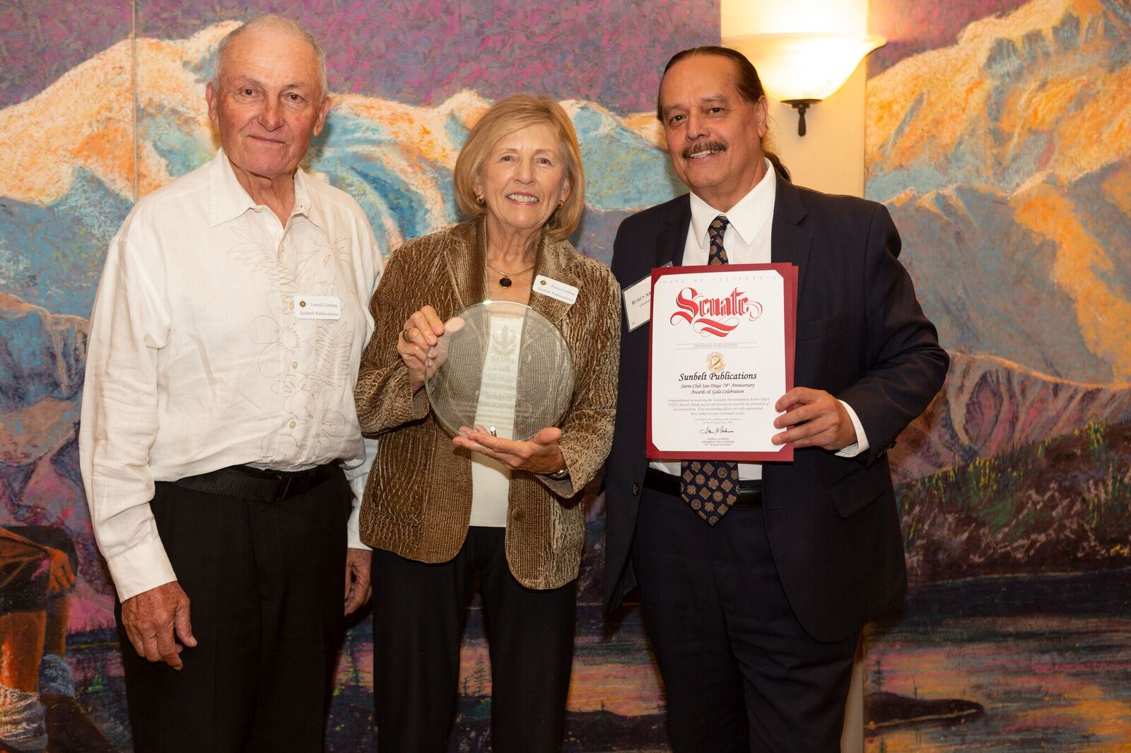 - Lowell & Diana Lindsay accepting FEAT Award for Sunbelt Publications and CA Senate Certificate of Recognition from Chapter Chair Ruben Arizmendi