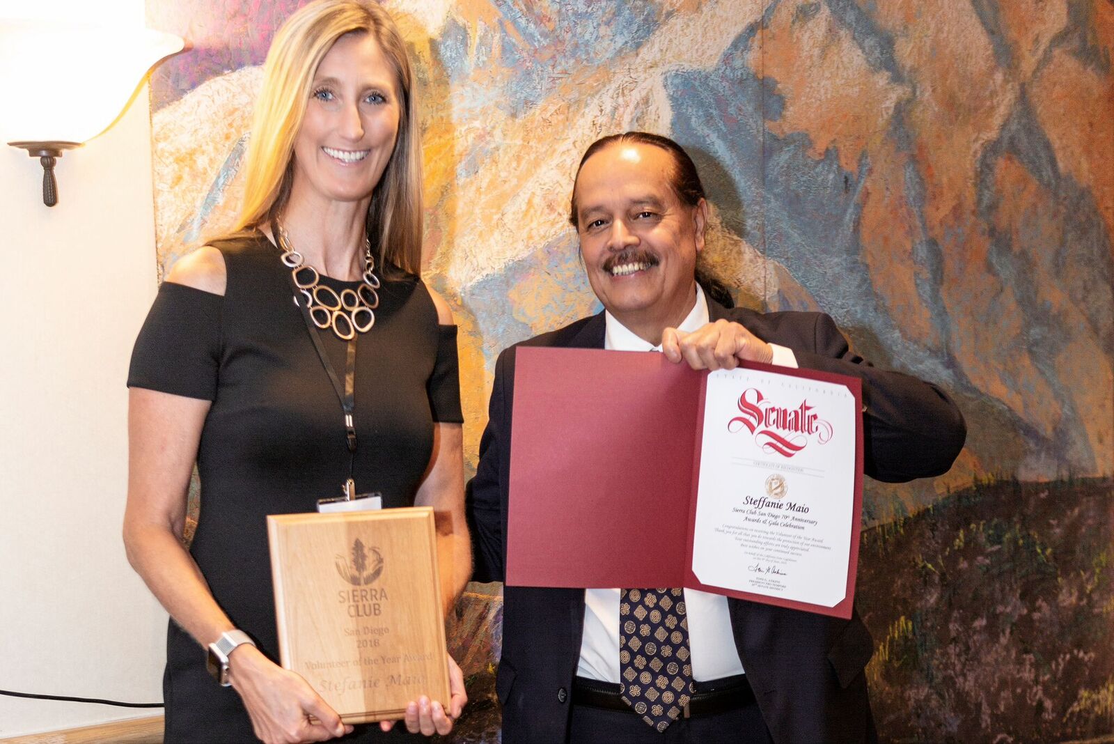 - Stefanie Maio accepting Volunteer of the Year Award and CA Senate Certificate of Recognition from Chapter Chair Ruben Arizmendi.